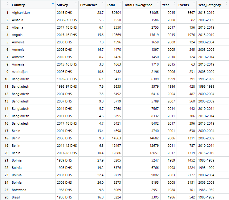 I am trying to analyze the trend of the prevalence of diarrhea in each country over time using the dataset provided by STATcompiler. My goal is to pool the prevalences of the DHS surveys of countries every 5 years (for example, pooling the prevalence of diarrhea from 1985-1989, 1990-1994, etc.) and then plot it over time.