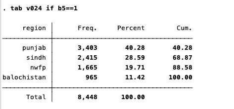 In the raw data there are 9177 children under 5 years old, 3705 in Punjab. If we restrict to children alive, then we have 8448 children and 3403 in Punjab. In the DHS report of 2006-07, table 10.5, there are in total 8367 children under 5 years old (presumably alive) and 4689 are in Punjab.