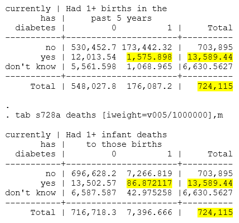 These were the numbers referring from the response by your on August 23rd stating: "I looked at the frequencies. For example, of the 724,115 women in the IR file in the NFHS-5, 13,589 (weighted frequency) say they currently have diabetes. 1,576 of the women with diabetes had a birth in the past 5 years. Of them, 87 had a child in the past 5 years who died as an infant. I think it would be very difficult to find a relationship between currently having diabetes and having had an infant death, especially if you take potential confounders into account. Because these are self-reports and the temporal sequence is reversed, any reviewers would be skeptical."