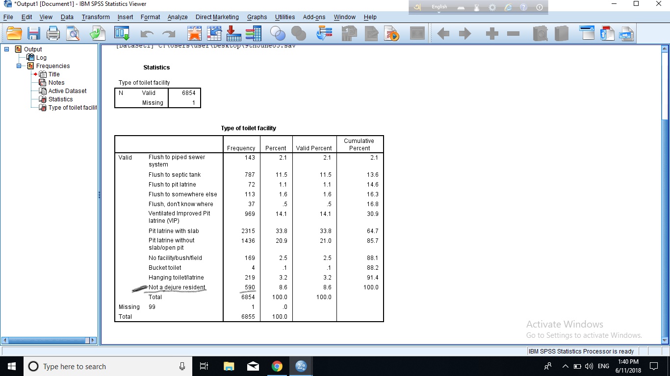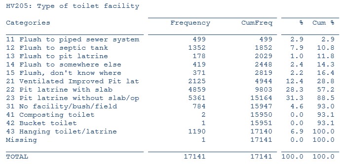 - As you can see, Bucket toilet (Code 42 here) and Composting toilet (Code 41 here) occur 0% (1 and 2 weighted cases, respectively). There is, in general, no need to analyze events that occur in very rare instances (which was done in the report). More information on minimum number of cases can be found in the following document from the DHSprogram website: http://dhsprogram.com/pubs/pdf/DHSM6/Final_Report_Tab_Plan_2 4Oct2014_DHSM6.pdf. Basically, in the tables of the DHS reports, if the entire row or the entire column is zero, it is not included in the table.