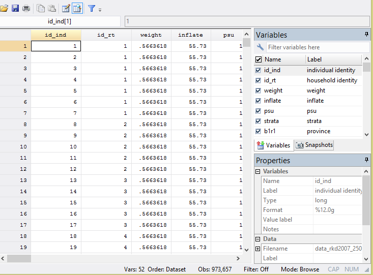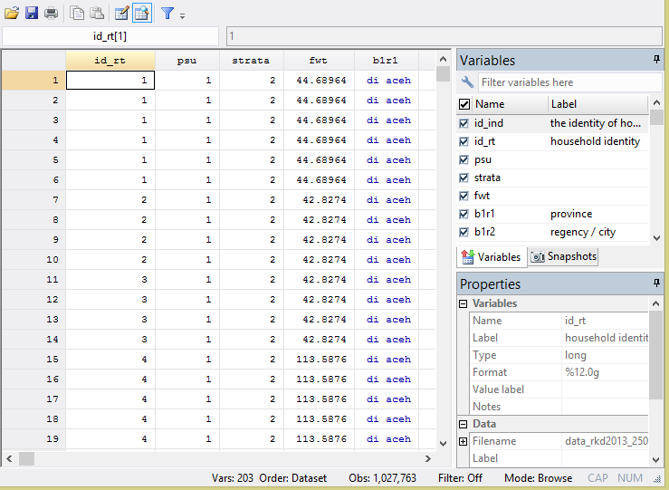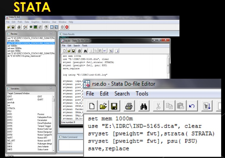 It's been a pleasure talking with you. I am a student who working my thesis by STATA. Could you please share your wide experience and knowledge to explain my research? My study as following: I have collected of massive data from National Institute for Health Research and Development, Ministry of Health. The participants of this research are households from all over of the country. The survey in 2007 managed to visit the 17.150 block census and collect 258.284 households and managed to bring together 972.989 individuals. Furthermore, in the health basic research data 2013, the team has been found, some block census and visited some 11.986 (99.9%) in the 33 Provinces, 497 districts/cities. The number of households is 294.959 of 300,000 (98.3%) by the number of household members 1,027,763 people.