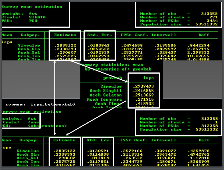 I would like to ask you again why the results number of observation of 5 provinces, in 2013 survey apparently significant different between results number of observation .svydes was {130,585} and others svyset was {14,512}, however in 2007 survey number of observation was same, between the .svydes was {92,526} and others svyset was {92,526 } like above? Which is the right command used to declare or set up the secondary data survey by STATA 12 or 14 version, both in 2007 and 2013 like attached? Do you have any insight about the problem?
