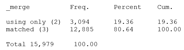 In the Myanmar DHS, this matches 12,885 cases and leaves 3,095 cases in the HR file unmatched (ie households that did not have a corresponding eligible woman in the IR file)