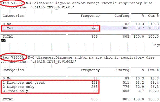 For example, when exploring variable V1605a, labelled 'diagnose and/or manage chronic respiratory diseases', only 611 facilities can diagnose and treat, and 247 facilities are missing.
